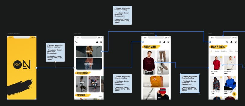 For this demonstration, I’m going to use OnPoint UI Kit by Lukas Jurcik, a design concept for an E-commerce app. Lukas was also amazing enough to make a prototype in Figma for us already, so I went ahead to make a little animation to show how the app looks like.